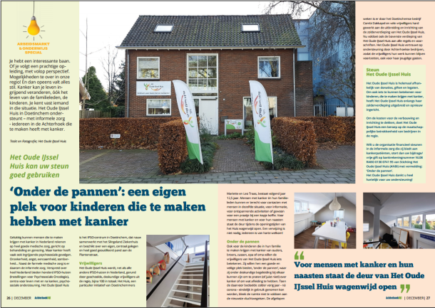 Ed Smit, directeur van Bureau Achterhoek en uitgever van AchterhoekBIZ Magazine heeft ons in de gelegenheid gesteld een artikel te schrijven over ‘Onder de pannen’: een eigen plek voor kinderen die te maken hebben met kanker. De zolderverdieping van Het Oude IJssel Huis werd verbouwd en uitgebreid met een dakkapel om kinderen en jeugd een veilige plek te bieden. Door het artikel hebben we met succes een beroep kunnen doen op sponsoren om de verbouwing te financieren.