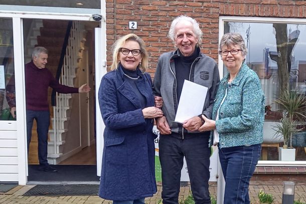 FOTO: In de deuropening Henk Wubbels. Vlnr Ietsje Wierstra, René Striewold en Maria Wolterinck.