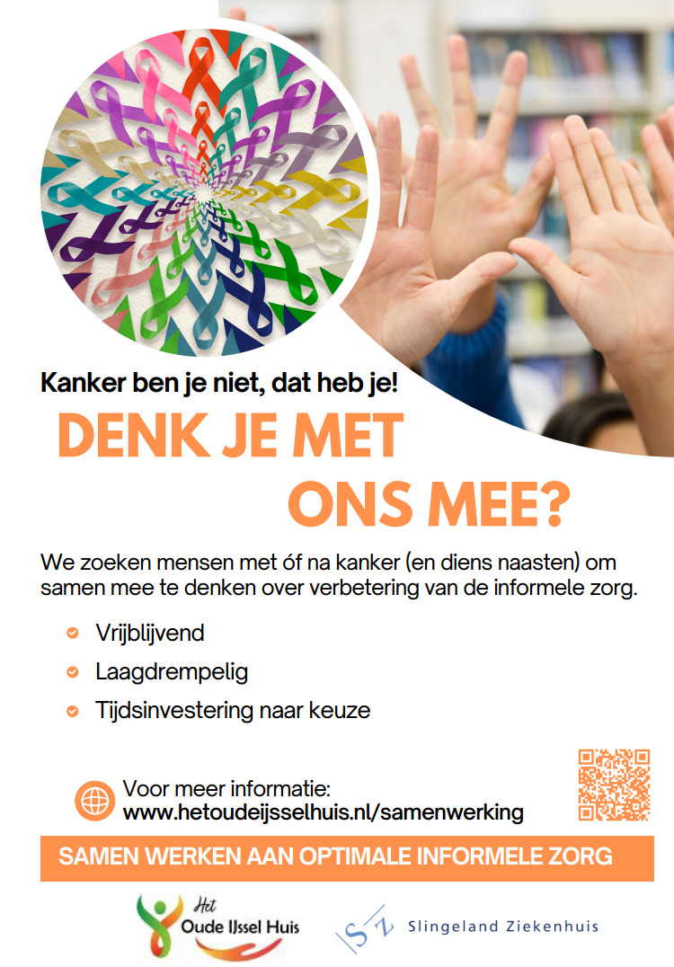 We zijn daarom bezig een klankbordgroep op te zetten die bestaat uit mensen die leven met en na kanker in de ruimste zin van het woord. Allereerst wordt deze groep opgezet om te zorgen dat de stappen die we maken in het vergroten van de samenwerking met het ziekenhuis en het Oude IJssel Huis op de juiste manier gebeurt. Daarnaast kunnen we beter ophalen waar de behoeften en wensen liggen en eventuele plannen vooraf checken.